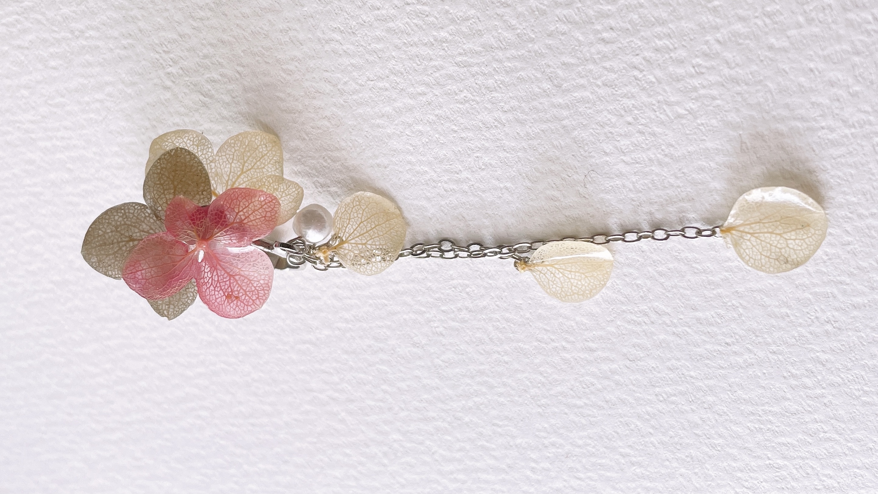 実際にはあり得ない一つの花にさまざまな色の花びらを持つ紫陽花のアクセサリーを作りました。