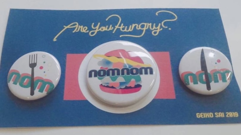 芸工祭という学園祭にだす公式グッズのアイデアとデザインを担当しました。 芸工祭のnomnomというテーマは咀嚼のむしゃむしゃという擬音語で作品を味わいつくすという意味で作られました。 缶バッジのデザインを考える際にこのむしゃむしゃという親しみやすくポップな雰囲気と味わいつくすというテーマ性を感じさせるデザインにしたいと思い真ん中にエンブレムを置き、 サイドにナイフとフォークの缶バッジをデザインした。台紙にも缶バッジありきの遊び心を加えたデザインをしたいと思い、缶バッジに合わせてナプキンとお皿が置かれた台紙を考えました。