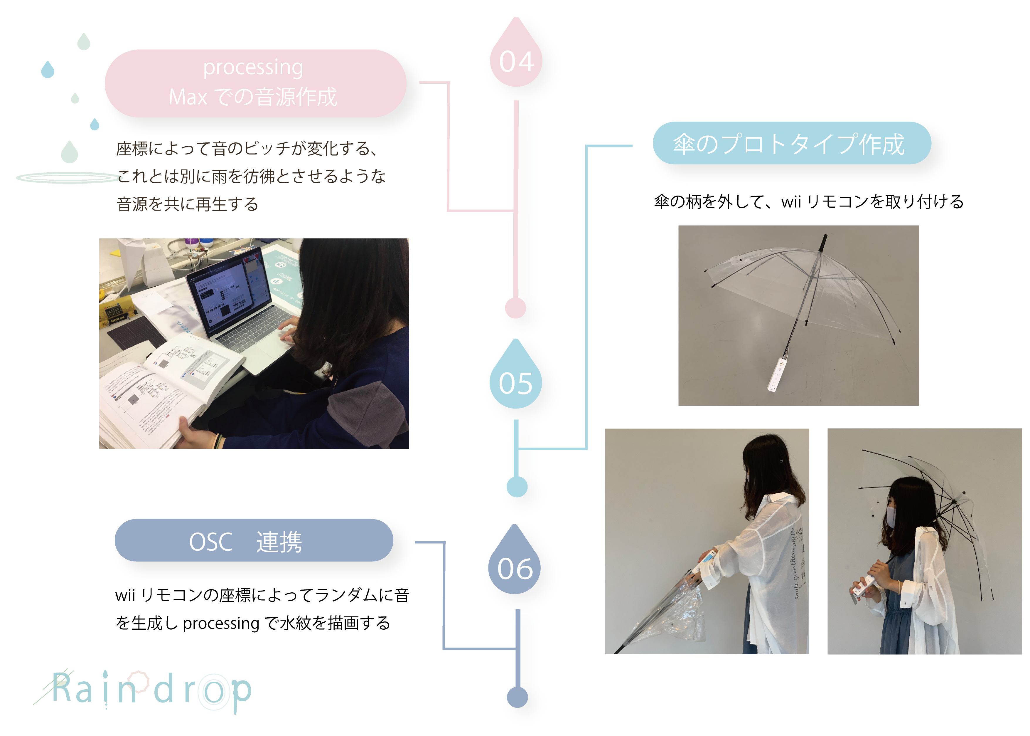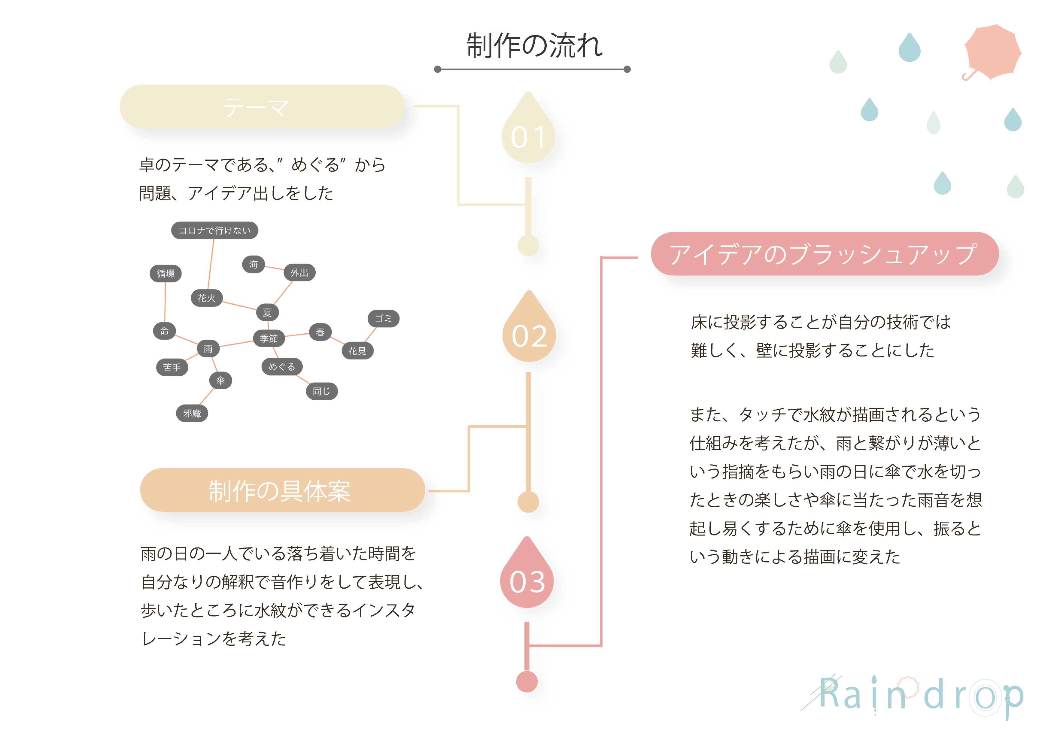 名古屋市立大学芸術工学部の学生による自主作品展示会「卓展」で展示した作品です。 「めぐる」という共通のテーマからメンバー全員でブレインストーミングを行い、各々の視点で「めぐる」にまつわる作品を制作しました。 制作と発表時期が雨季で私自身が雨に苦手意識があったため、雨をポジティブに捉えた作品を作ろうと考えました。