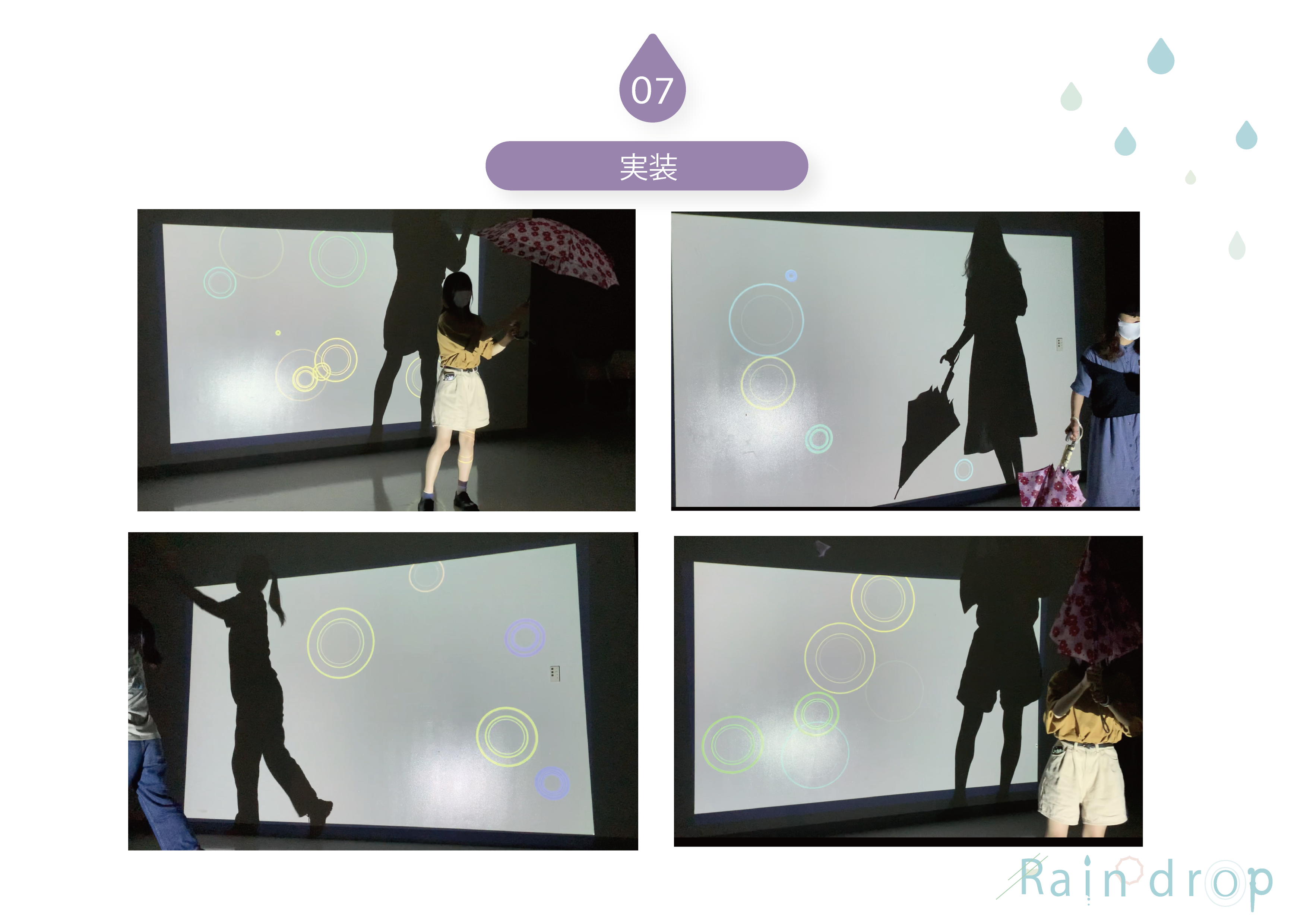 子供の頃に抱いていた雨の日の水溜りや音、雨具を降る楽しさを体験してもらうことを狙いとしました。 子供の頃に水溜りを見つけて水紋を作って遊んだりカラフルな雨具を使ったり、雨の音と雨が金属などにぶつかった時の音を楽しんだり、私が子供の頃に抱いていた雨のポジティブなイメージをインスタレーションにしました。
